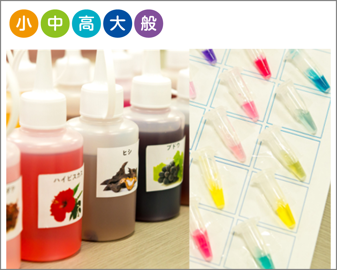 植物がカラフルなのは、『色素』とよばれる化合物を作っているからです。自然界には様々な植物色素がありますが、状態で色が変わるものなど特徴も様々です。身近な植物に含まれる色の変化を観察してみよう!