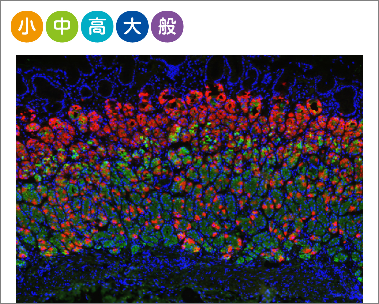 体の中には色々な臓器があり、それらの臓器では様々な形の細胞からできています。体の中で働くいろいろな細胞を見てみよう。私たちの研究室では、体の中で幹細胞が増えて分化するしくみを調べています。シャーレの中で増やした幹細胞を見てみよう。