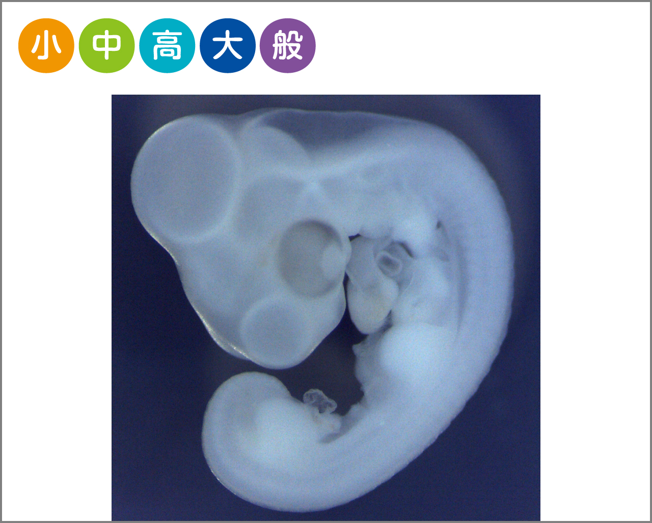 私たちは、体が出来上がっていく仕組みを明らかにするために、ニワトリの胚を使って研究をしています。展示するのは、卵の中で出来上がりつつある胚です。