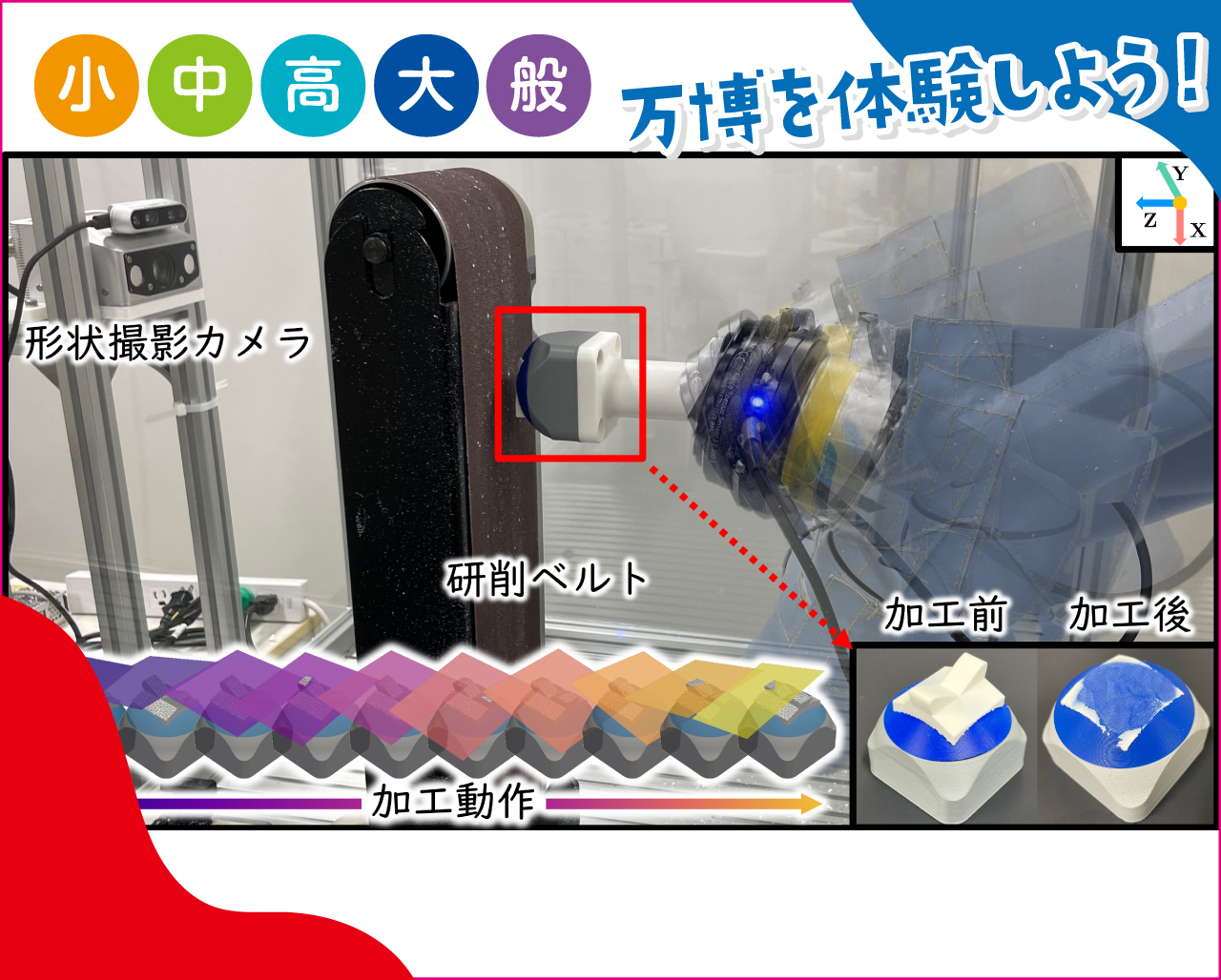 人の研削による形状加工をAIロボットによって自動化します。カメラで撮影した対象の形状を元に、AIはロボットの動きや削る順番を計画し、研削するロボットを展示します。