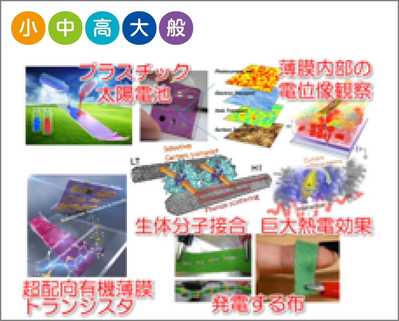 有機半導体をベースに、熱から電力を生み出す熱電変換材料や次世代プラスチック太陽電池の開発にかかわる基礎と応用研究をしています。当日は、実際に作成した発電する布やサーモグラフィーなどを体験していただきます。