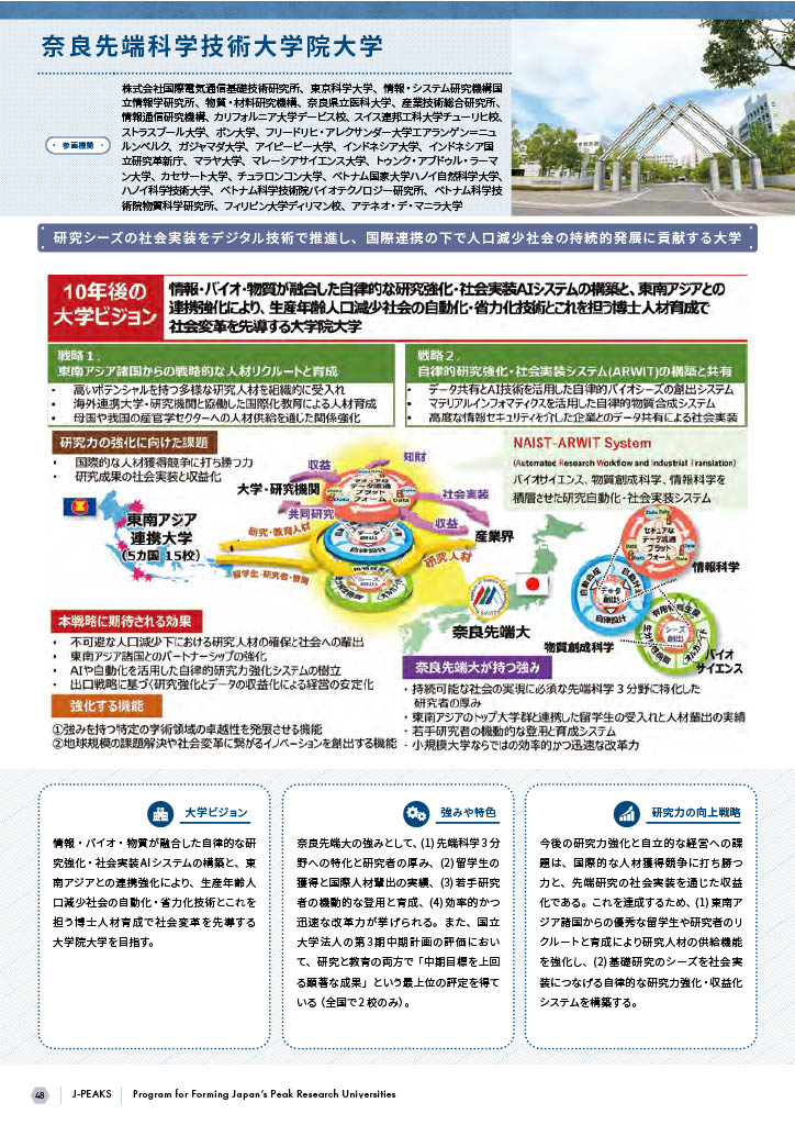 国内外のJ-PEAKS参画機関とも連携し、10年後の未来を見据えてNAISTが提案する「自律的研究強化・社会実装システム」(ARWIT)について、「ARWIT推進センター(2026年1月設置予定)」の一翼を担います。オープン&クローズのセキュアな次世代研究・社会実装システムの社会展開に寄与します。